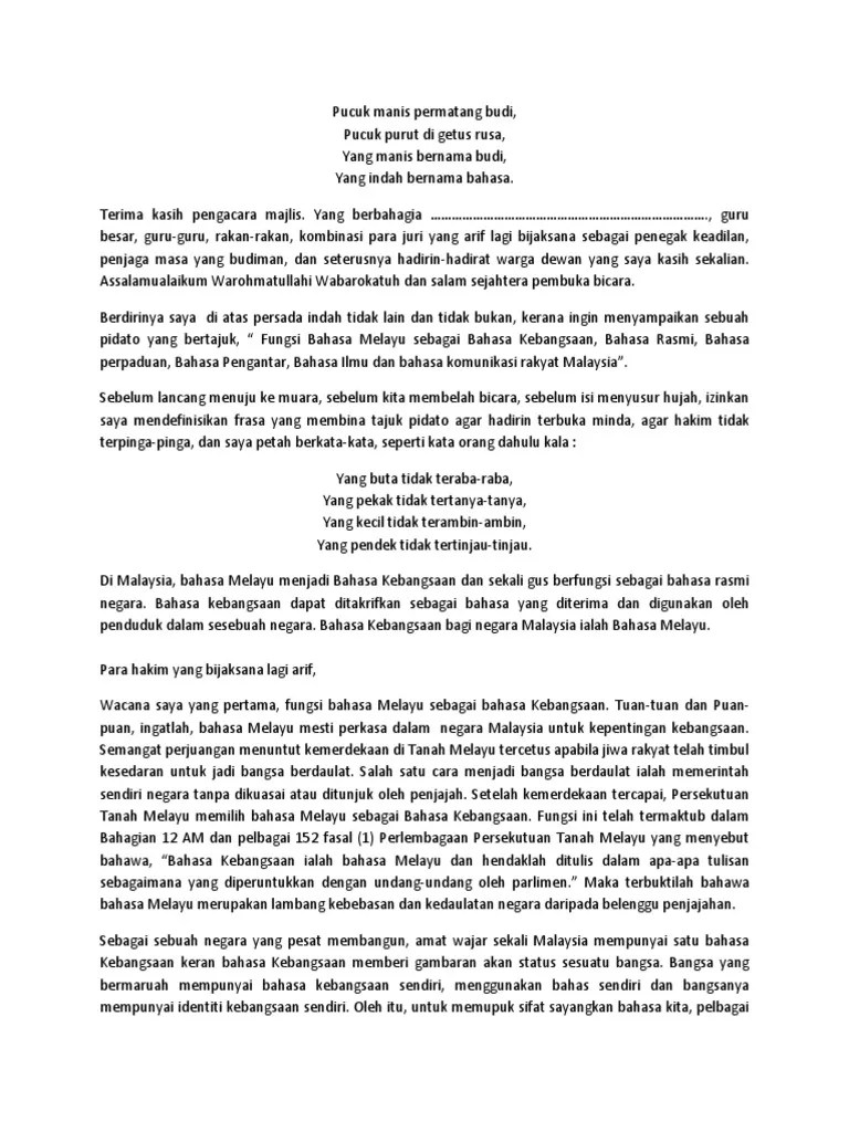 Contoh teks pidato bahasa melayu sekolah . Kita boleh melihat pada satu contoh iaitu kapal terbang. Bahasa melayu sekolah rendah teks ringkas pidato bahasa arab. Bahasa lambang perpaduan rakyat assalamualaikum, salam sejahtera, salm pidato piala diraja. Bahasa melayu tonggak perpaduan bangsa malaysia.